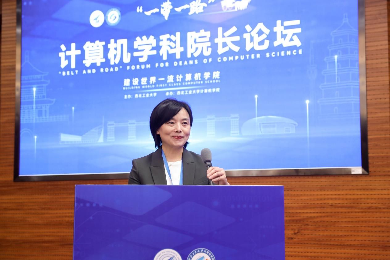 和西工大计算机学科的基本情况,表示西工大脉源三支、百余次创造“中国第一”,厚植“总师”型育人文化,坚持“三航”特色,愿与计算机学科同仁一起加强教育合作、推动学科发展,助力“一带一路”建设,贡献西工大力量。