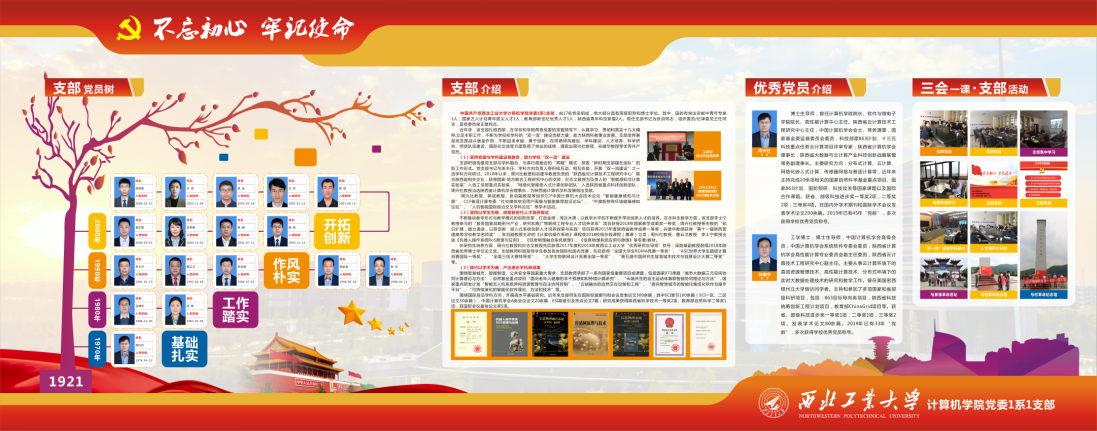 支部优秀党员和班子成员带头模范遵守党章党规,做好教学科研工作,争做“四讲四有”合格党员。扎实开展“弘扬爱国奋斗精神、建功立业新时代”活动,传承和弘扬以康继昌教授为代表的西工大老一辈计算机人“求真创新、立德树人、献身国防”的崇高精神。以“一位资深教授或领导干部”+“一位支部委员”+“一位新进青年教师”的“1+1+1”结对帮扶为抓手,细致了解每一位新进教师的思想动态和工作、生活情况,并通过组织一流学科方向建设与科技创新、自然基金申报辅导等专题研讨会,帮助青年教师尽快找准个人研究工作与团队研究方向的结合点,从而更快、更好地融入团队。近3年来,新入职的6位青年教师都是第一次申报即顺利获批青年基金,资助率100%。