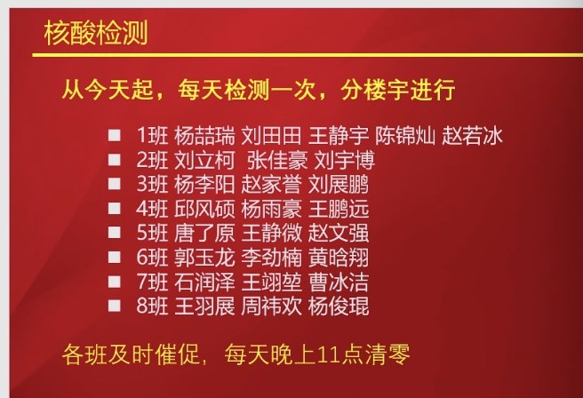 在疫情传播的重压之下,督促同学们每天按时进行核酸检测成为重要一环。2018级辅导员组织大家开展多次大班会和班委会完成防疫工作部署,坚定同学们的信念,增强同学们的信心。大家面对疫情也积极配合市政府、学校和学院的部署和管理。