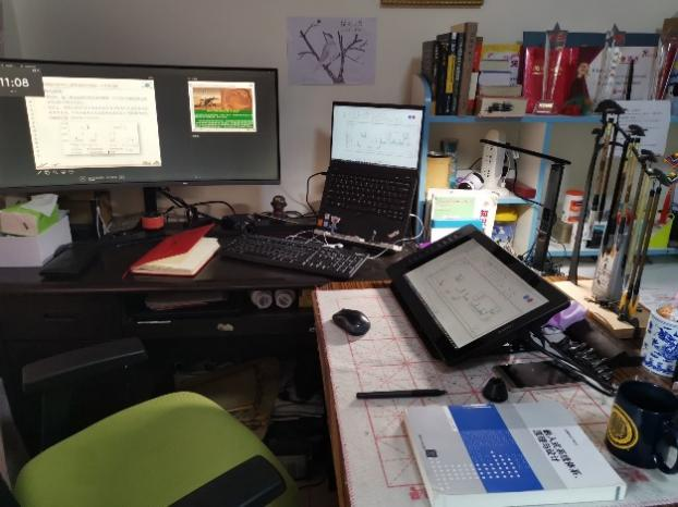 他还不断优化并完善“QQ课程群+腾讯会议(主)/腾讯课堂(辅)+屏幕激光笔+手写数位屏”的网络授课环境,这套授课模式可以提供学生管理、视频教学、手写板书、焦点同步、提问互动、课后答疑、作业布置等线上全流程教学功能,有效解决了线上教学中“教师-屏幕-学生”融合度差的难题。近年来,张凯龙老师还将摸索出数位板、线上教学工具使用方法,并编写成手册,在百度文库、教学群等进行分享,促进了线上教学工作的开展。