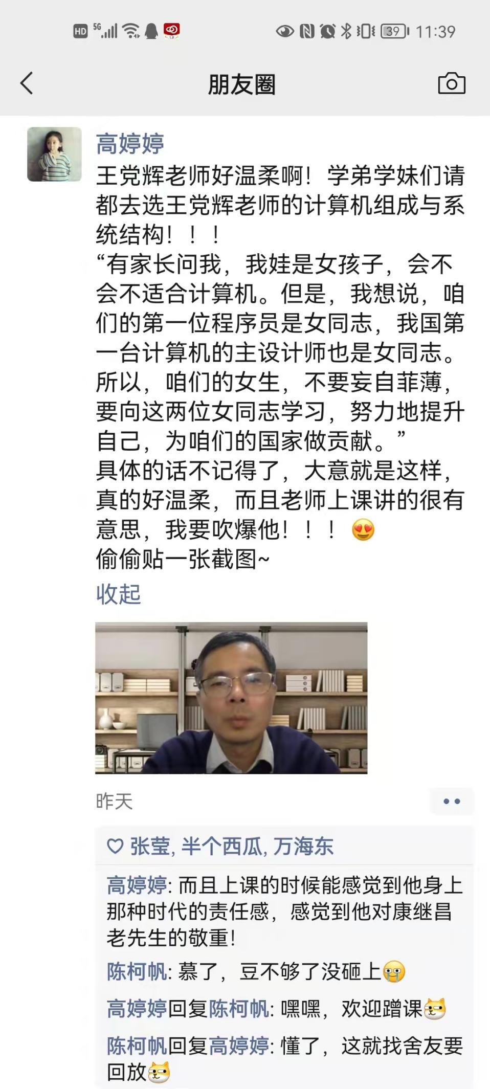 金杯银杯不如学生的口碑,开课两天,学生们就开始在朋友圈为老师“拉粉儿”。专业课育人,让学生克服网课恐惧焦虑的同时,不忘传承康继昌老一辈计算机人的精神,课课有思政,王老师,优秀!