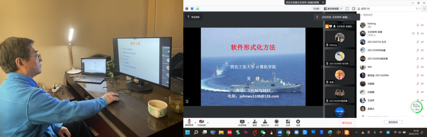 吴健老师,在春季学期负责讲授《软件形式化方法》研究生专业基础课程。吴老师除了用心讲好课程内容外,还灵活结合行业实际,强化课程思政教学。例如,在讲述形式化方法对软件质量保证的作用时,结合我国航空工业现状以及曾经出现过的灾难性事件案例,还有最近西安防疫一码通系统故障产生的不良影响,生动说明了课程学习的重要性,激发了学生的爱国情怀和历史责任感。同学们说,课程伊始,就在学习专业知识的同时,接受了一次生动的思想教育、印象深刻,期待通过课程学习,掌握更多本领,将来更好地报效祖国。
