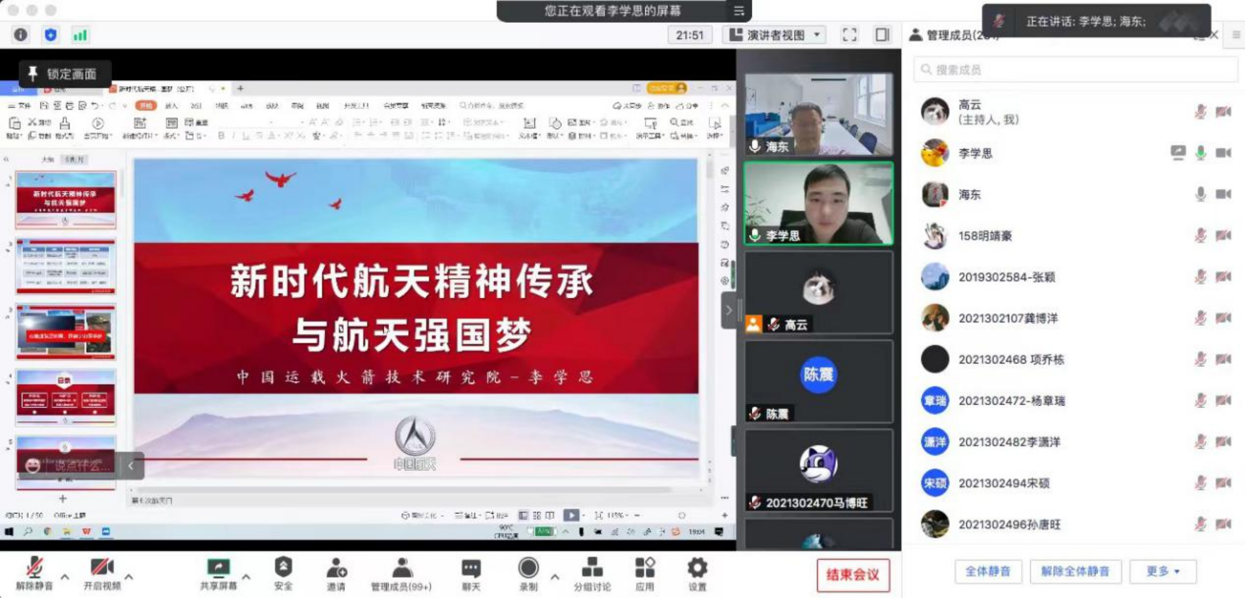 李学思从我国航天发展历程与辉煌成就开启报告会,讲授了航天事业发展的由来、重要历程以及六十余载取得的辉煌成就。第二部分讲授了航天精神永传承,分享了陈福田、龙乐豪、余梦伦等老一辈航天人身上体现的航天精神和背后的航天故事,感悟前人的精神意志。第三部分分享了我国航天事业的发展战略以及共同憧憬了航天强国的建设。