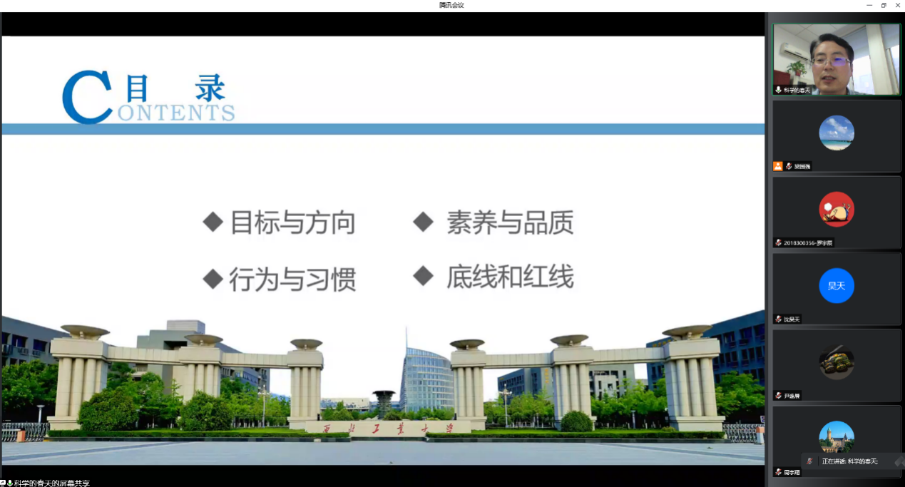 第二部分李春科重点强调了素质和品质的重要性。他结合西工大优秀校友和最近的世界局势,强调成功和进步的基本规律,要把握其核心要素——远见。在远见的基础上,需要进一步培养三个重要品质:果断、大度和责任。第三部分介绍了行为与习惯的重要性,希望大家努力做到以下六点:第一,愿意吃亏;第二,常反思自省;第三,干就干到最好;第四,控制自己的情绪,做个高情商的人;第五,做好时间管理;第六,凡事要学会辩证思维和辩证思考。最后,李春科向同学们强调了底线与红线的重要性。他要求大家将来无论做何事、任何职,都要廉洁自律,拒绝贪腐。要具有清清白白的行为、光明磊落的态度,堂堂正正的做人。