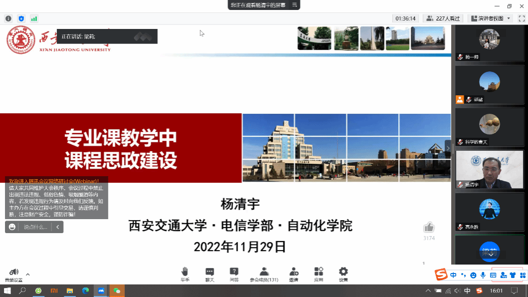 王党辉副教授、西安电子科技大学蔺一帅副教授、西安交通大学杨清宇教授先后做交流报告,分别从人才培养目标、课程思政建设目标,课程思政教学设计,思政素材库建设等方面,讲解了各自在课程思政教学中的经验和成果。