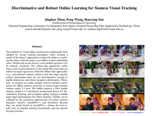 周靖皓本次投稿的论文"Discriminative and Robust Online Learning for Siamese Visual Tracking" 主要介绍了其大二期间在目标跟踪(Object Tracking)方面的工作。目标跟踪是计算机视觉领域最核心和最基础的任务之一。本次论文主要提出了一种用于提高孪生网络跟踪算法(Siamese Trackers)鲁棒性和判别性的在线模块,模型在六个标准数据集上超过或达到当前的最优性能。这篇论文三个作者均来自国产偷拍