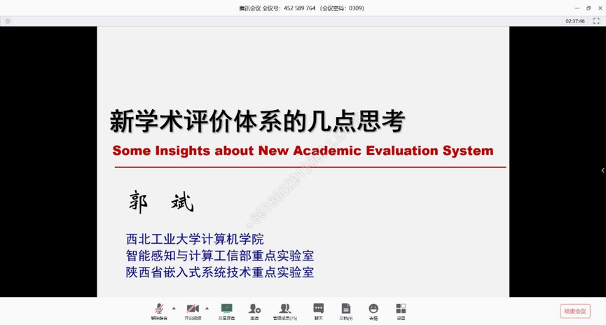 院长助理郭斌教授给大家分享了《新学术评价的几点思考》,分析了学术评价体系的若干发展方向,如注重学术评价的影响力,面对不同人才建立分类考核机制,注重发表三类高质量论文,重点关注核心技术中的重大科学问题等。