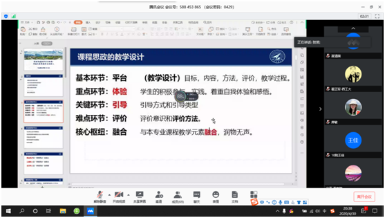 报告结束后,李春科书记小结道:本次活动是学院疫情中开展课堂思政教学的首次培训,希望各位专业老师高度重视课堂思政,把课堂思政作为自己落实立德树人、教书育人和专业教学的份内职责。坚持知识传授与价值引领相结合,回归教师教书育人的初心和天职;二是克服嫌麻烦和怕的心理,加强学习,早日掌握“挖掘、渗透、引导”;三是深入挖掘提炼计算机专业课程中的思政元素和德育功能,实现思政教育与专业教育的协同推进,把专业知识与思政元素巧妙结合、精心设计,把思想引领、价值塑造得心应手地应用于课堂中,进而实现知识传授、能力培养与价值引领的有机统一,推进全员、全过程、全方位育人的大思政工作格局。