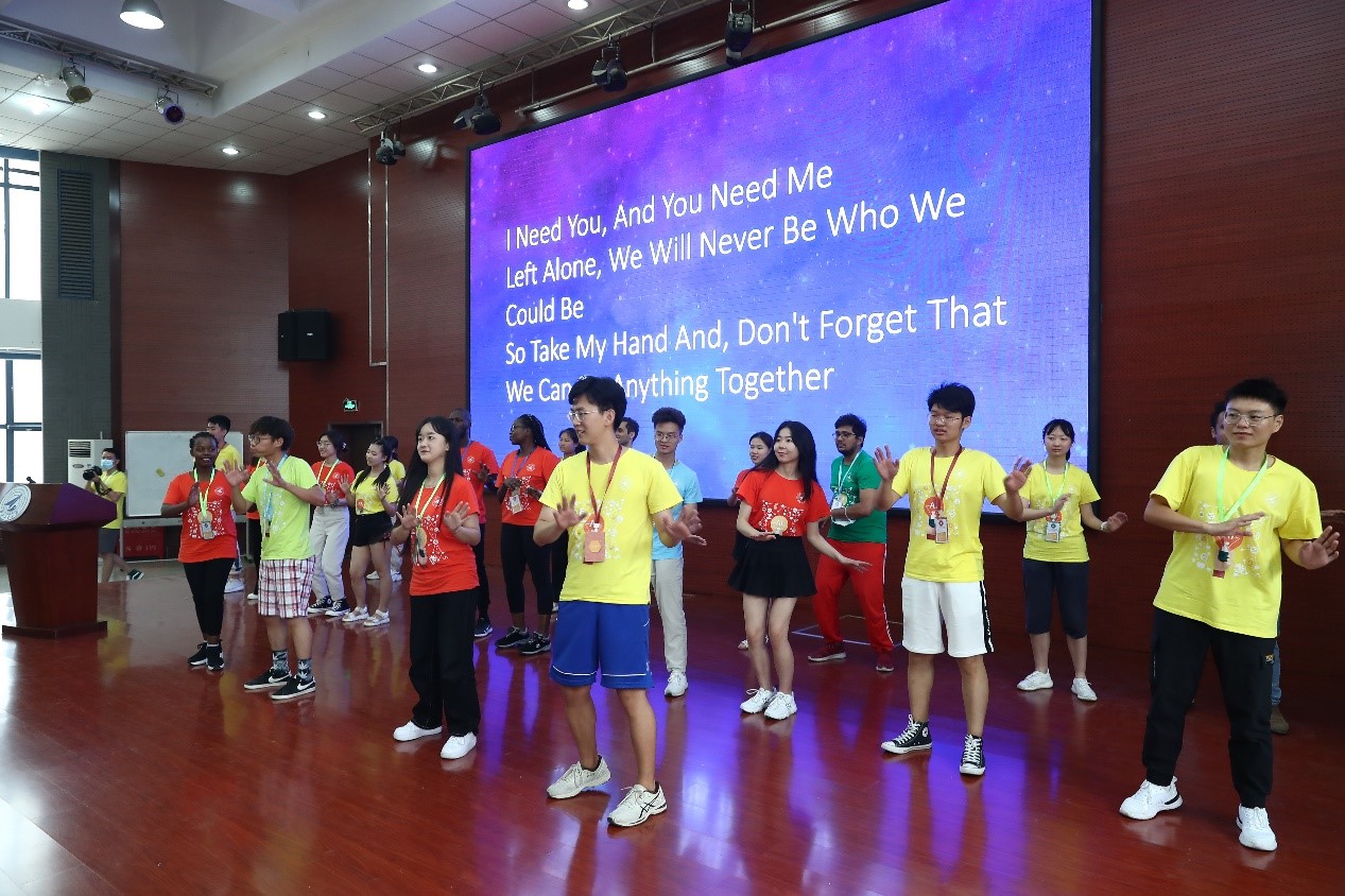 全体Coach、Programm和Logistics带领营员合唱营歌“JustOneDrop”,美妙的歌词歌声与亲和的舞蹈动作展现了全体参营人员的阳光活力,让大家耳目一新,将开营仪式的现场氛围带入到了高潮阶段。